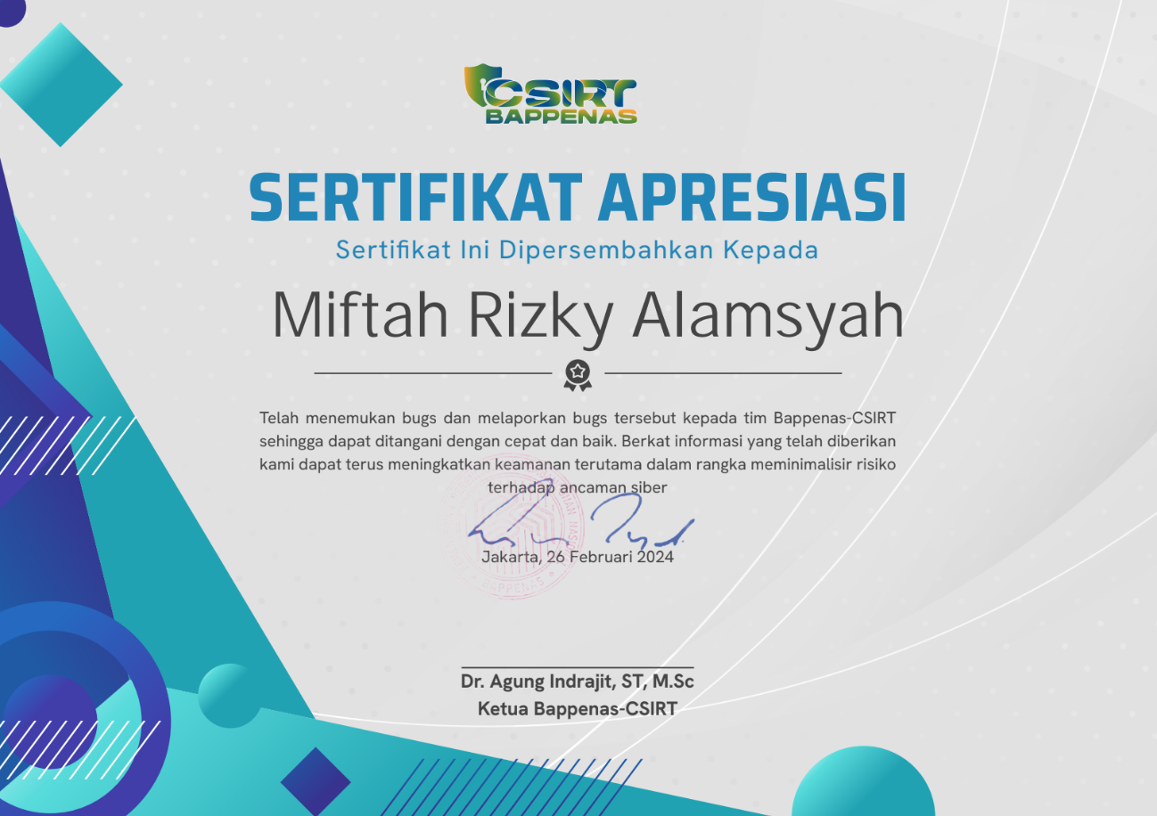 Appreciation from the Bappenas team for reporting security vulnerabilities on their website.