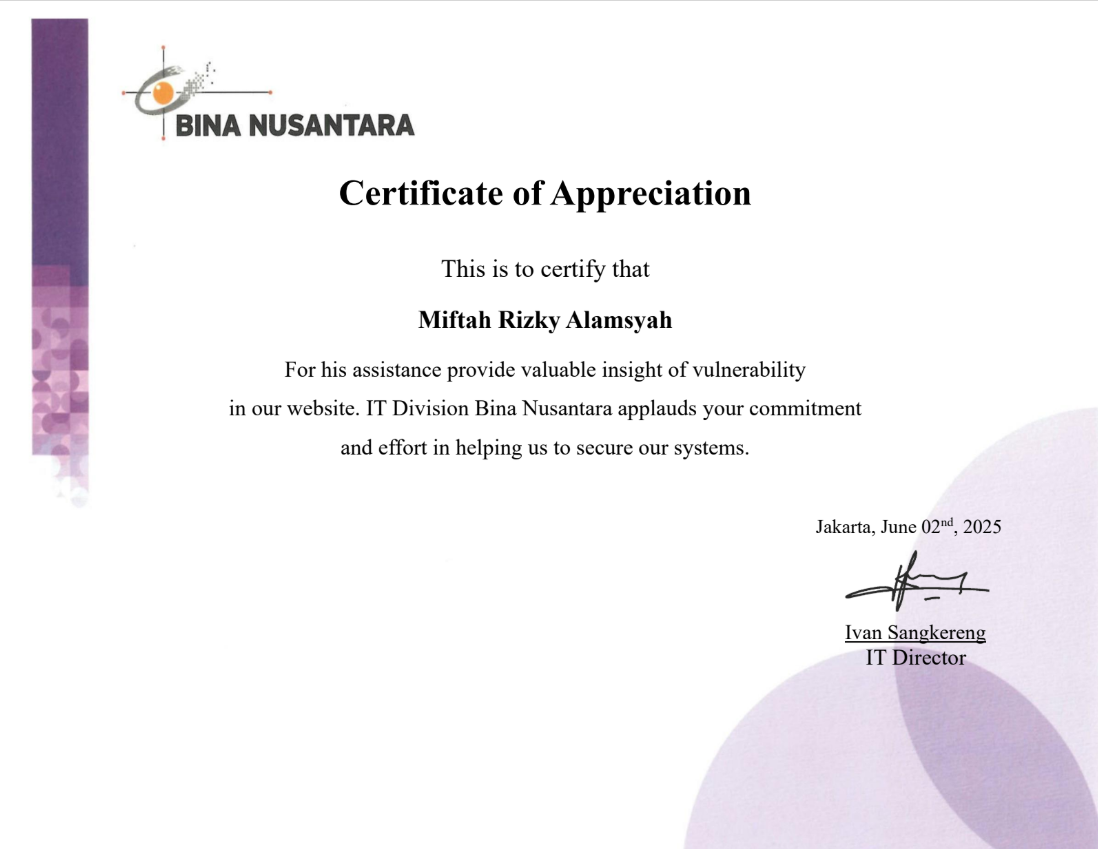 Appreciation from the Binus team for reporting security vulnerabilities on their website.